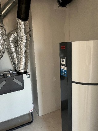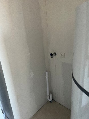 De technische ruimte is alleen vanuit de slaapkamer te bereiken. Daar is ook de aansluiting voor de wasmachine.