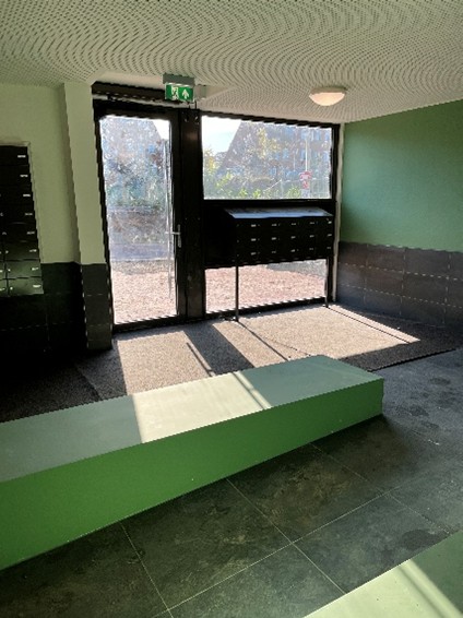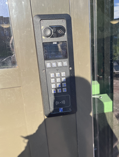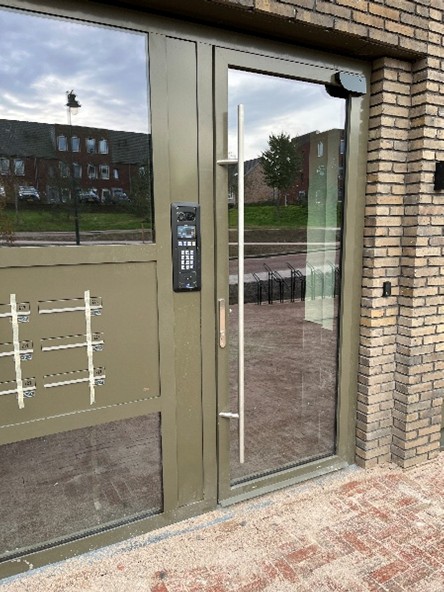 - De toegang tot het gebouw werkt met een pasje waarna de deur automatisch opent. Bezoekers kunnen een nummer intoetsen en de bewoner kan de bezoeker zien en spreken.