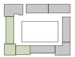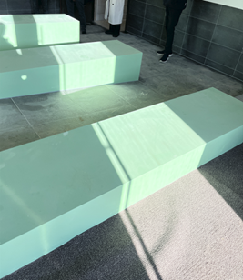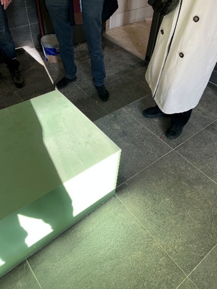 De entree van het gebouw bezoeken we als laatste. Bij de entree valt de hellingbaan met groene blokken op. Bij de laatste bocht is er ook een afstapje, wat wellicht onveilig is voor mensen in een rolstoel.