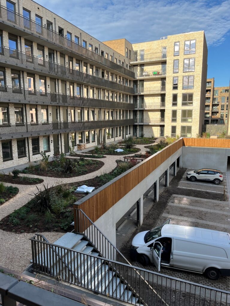 We lopen naar binnen via de ingang van de parkeergarage. Deze is voorzien van een stoplicht. De parkeerplaatsen zijn genummerd. Sommige zijn overdekt en de andere bevinden zich op het middenterrein. Voor de 71 appartementen van Woonstede zijn er slechts 31 parkeerplaatsen te huur. De bomen op het middenterrein moeten nog worden geplant. Voor de buitenparkeerplaatsen zijn grastegels toegepast.
