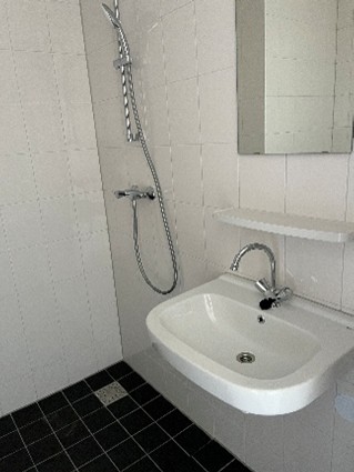 - De badkamer is nog niet volgens de nieuwe inrichting van Woonstede. De douchekraan heeft nog draaiknoppen en er is een staande toiletpot. De verwarming in de badkamer vindt plaats door middel van een elektrische designradiator.