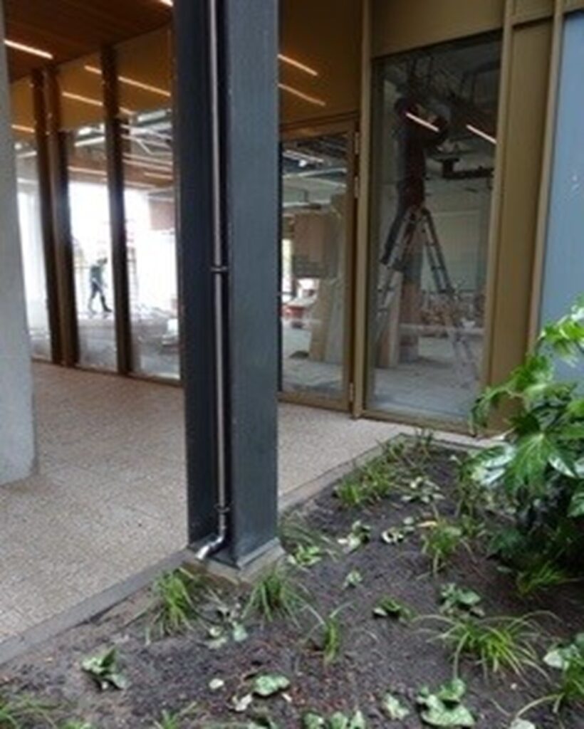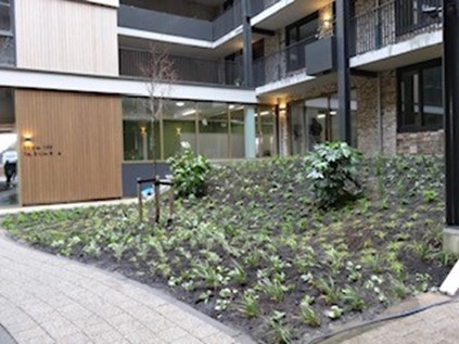 Langs de gevels worden klimplanten geleid van de pluktuin Op het dak van de eerste verdieping is een daktuin aangelegd en op de begane grond is een binnentuin aangelegd. Het hoogste dak is voorzien van sedum.