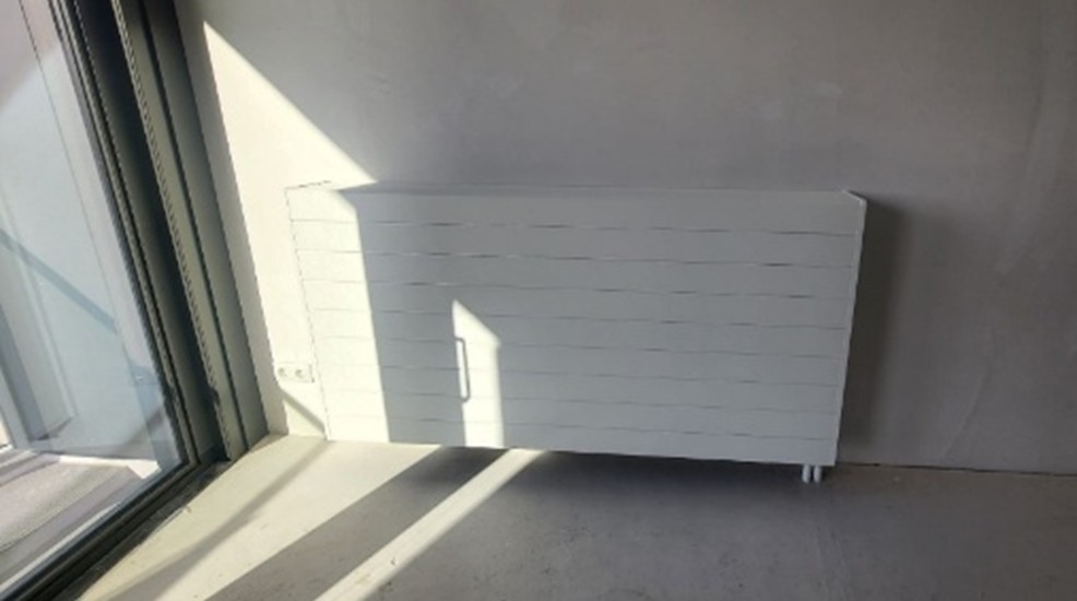 Verwarming geschiedt door middel van een aansluiting op het warmtenet en WTW-systeem. In de woonruimten zijn convectoren geplaatst die veel ruimte innemen en van invloed zijn op de inrichting (zie onderstaande foto).