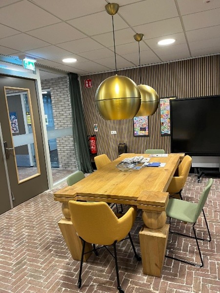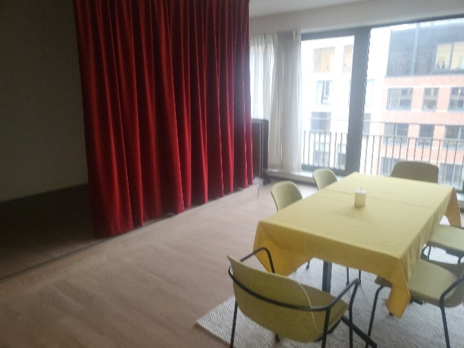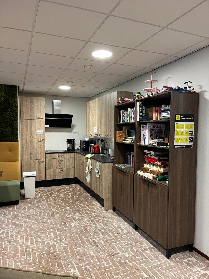 De rondleiding eindigt in de kookstudio die bestierd wordt door bewoner Liesbeth. Ze vertelt enthousiast over ‘haar’ kookstudio. ‘Ze hebben hier laatst sambal gemaakt. Of koken hier gezamenlijk, we hebben ook een kookclub.’ Gerda vult aan: ‘je kunt het ook reserveren als je je verjaardag wilt vieren met je familie en vrienden.’ Zoals in alle collectieve ruimten ligt ook hier een rooster waarop je kunt aangeven dat je de ruimte wilt reserveren of wilt intekenen voor een bepaalde activiteit.